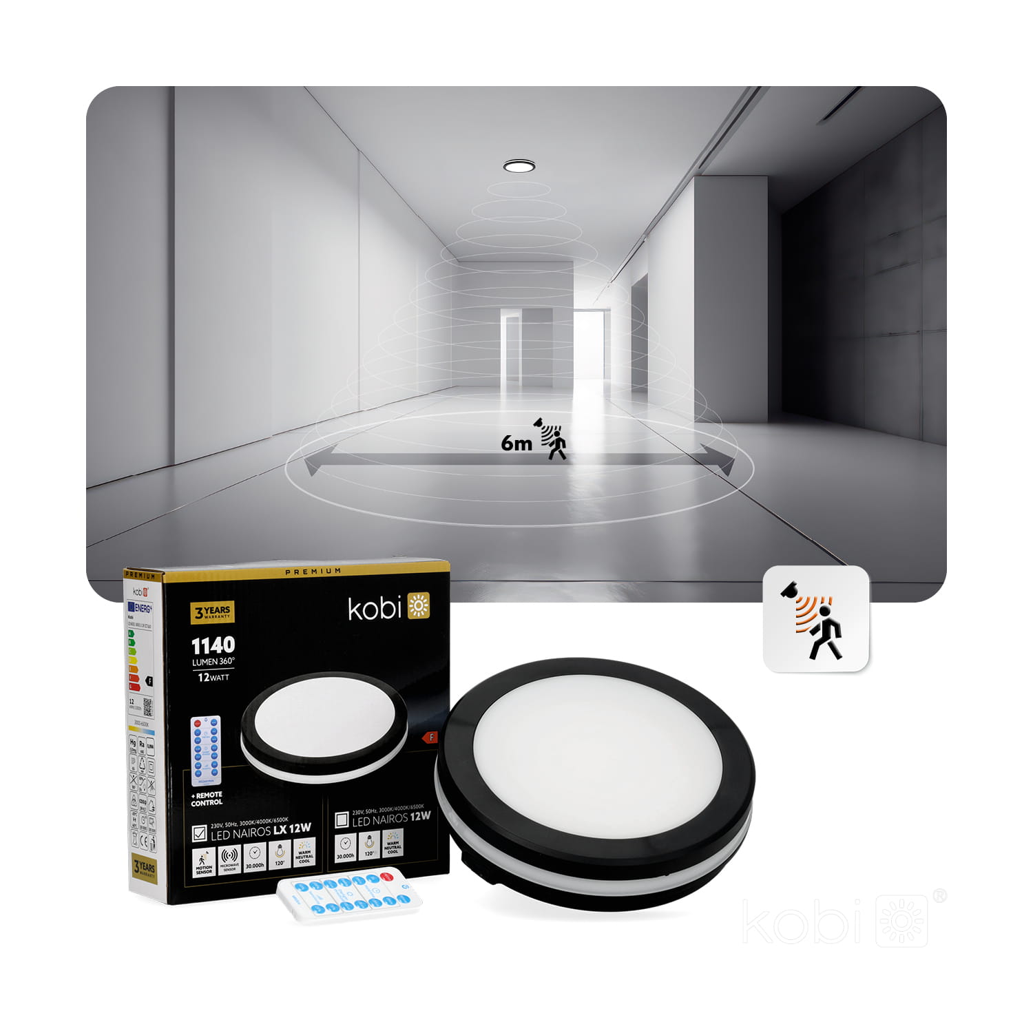 Plafon czarny LED NAIROS z czujnikiem ruchu i zmierzchu 12W zmienna barwa + sterowanie pilotem IP65 Kobi